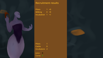 The thing about the pilots having their own choices is interesting, although I feel like it could diminish from the actual gameplay, especially if the reason is only explained later in game or something like that. Since I imagine 99% of people playing this assume you're hypnotizing and enslaving the pilots, like you'd expect from the hypno genre (and the term "captured pilots"). Maybe during the end-of-round results screen, you could mark one job as "recommended", so you'd get more captured pilots choosing that role? Or, if you get some aspect of control over it. Like, if there were 3 main "rooms" that the captured pilots choose randomly between, but there were sub-jobs within those "rooms" that you could choose. Like, there could be a "production room" with milk and cores, and a "support" room, where you could put people to... IDK, speed up transformation time or something? That's probably way too complicated, though.